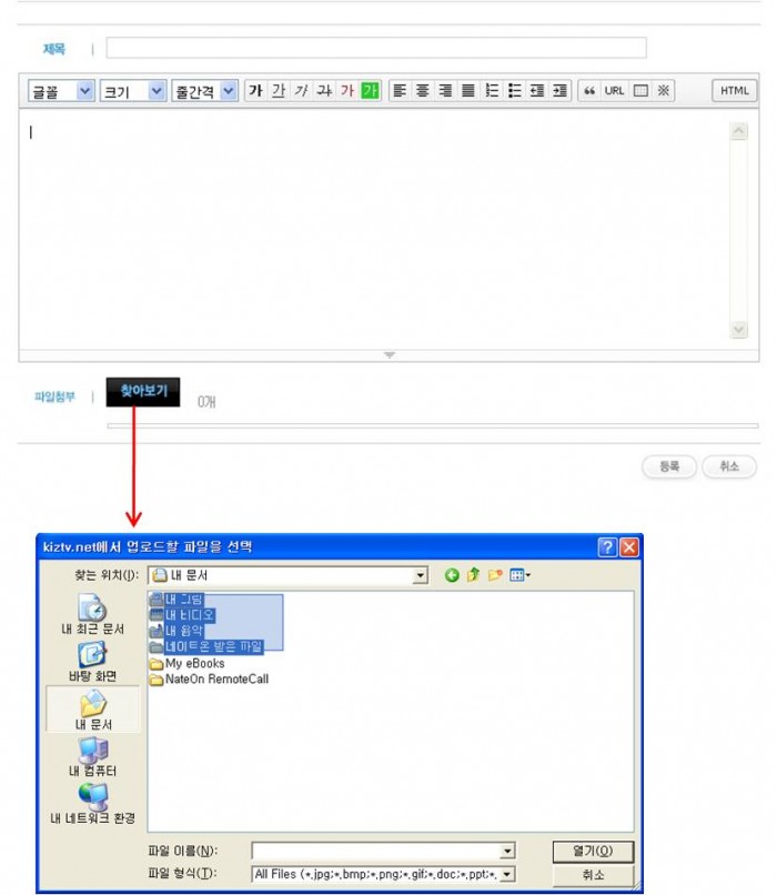 아래그림처럼 '찾아보기'를 클릭하고 원하는 파일전체를 드래그하여 선택 후 등록합니다.